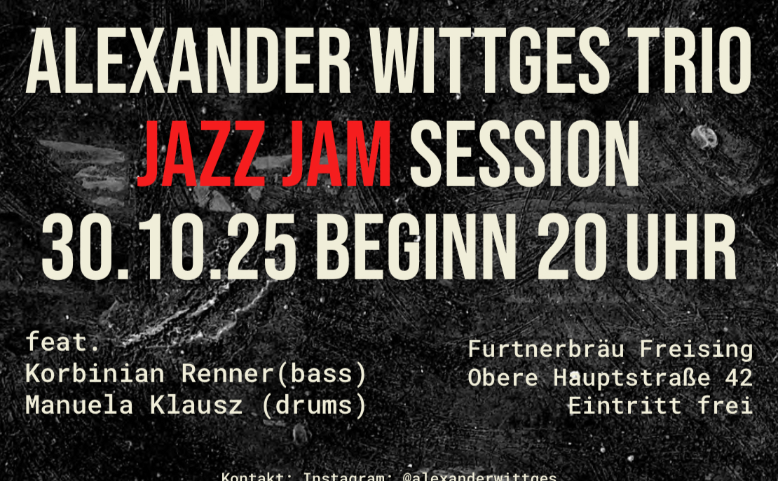 Jam Session des Alexander Wittges Trios. Feat. Korbinian Renner (Bass) Manuela Klausz (Schlagzeug) „Eine Jazz-Jam-Session ist ein offenes, gemeinsames Musizieren von Jazzmusikern, bei dem sie improvisieren und spontan spielen, oft ohne vorherige Absprache oder festgelegte Arrangements. Es ist eine Gelegenheit für Musiker, ihr Können zu zeigen, neue Ideen auszuprobieren und sich mit anderen Musikern auszutauschen.“ Der Ablauf ist wie folgt geplant. Um 20 Uhr eröffnet die Opener Band mit einigen Jazz Standards und Eigenkompositionen den Abend und sorgt für die ersten Jazz Vibes im Furtner. Ab 20:45 werden vom Session Leiter dann Vorschläge für Songs & Musiker Gruppen gesammelt, die dann Anschließend auf der Bühne performen. Erste Bühnenerfahrung ist für die Teilnahme an dieser JAM Session notwendig, da es keine Übungsstunde ist. Wer sich an seinem Instrument vorbereiten möchte, hier ein paar Songs, die regelmäßig von den Teilnehmern „gecalled“ werden: • Caravan • Autumn Leaves • Almost like being in Love • Alone together • Blues in F • ... und ähnliche Songs wie man sie im Jazz Real Book findet. Make it Swing!