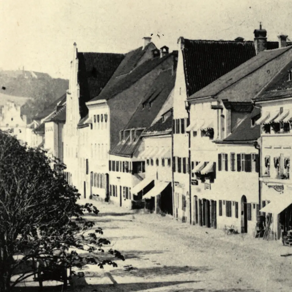 Blick in die Obere Hauptstraße in Richtung Westen: Links im Vorder- grund die Kastanienbäume, die entlang der offenen Stadtmoosach gepflanzt wurden, im Hintergrund das alte Furtner-Anwesen (Gebäude mit hohem gotischen Giebel und das rechts daran anschließende Haus) sowie das 1875 abgebrochene Veitstor, dahinter der Weihenstephaner Berg (StadtA FS, Fotosammlung, Nr. 2.135).
