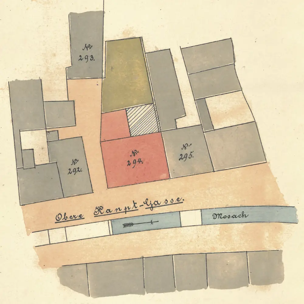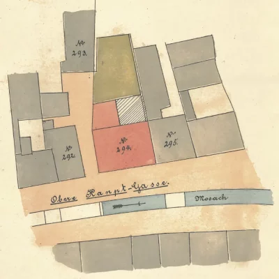 Das neu zu erbauende Gasthaus Furtner (rot) sowie die vom Brand verschonte Brauerei (braun), davor die 1886 von der Höhe des Furtners bis zur Bahnhofstraße noch offene Stadtmoosach; der oberste Teil war bereits 1880 überdeckt worden, Lageplan von Heinrich Lang, 30.09.1886 (Stadt Freising, Bauakte Obere Hauptstraße 42).