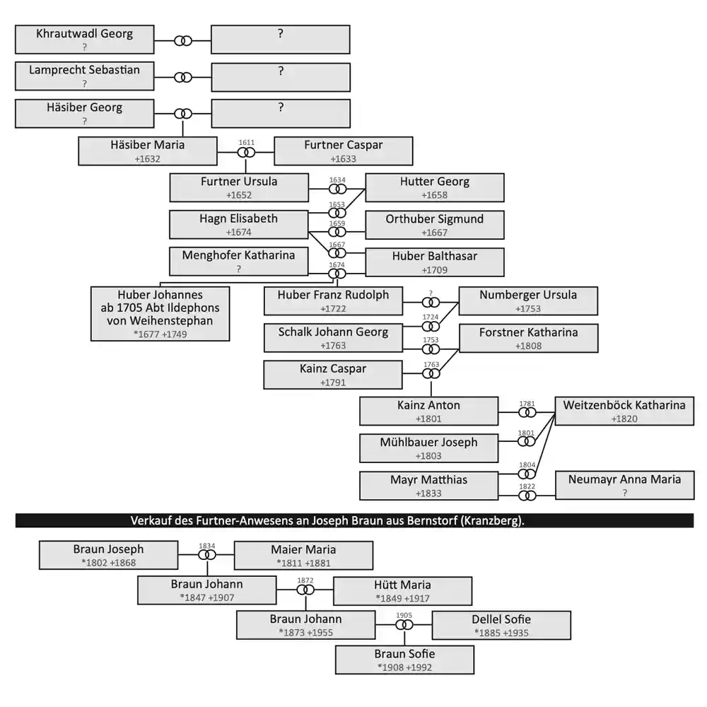 Die Familien- und Besitzverhältnisse der Furtnerbräuer seit dem späten 16. Jahrhundert, Darstellung nach Untersuchungen Josef Scheuerls und Franz Bichlers.